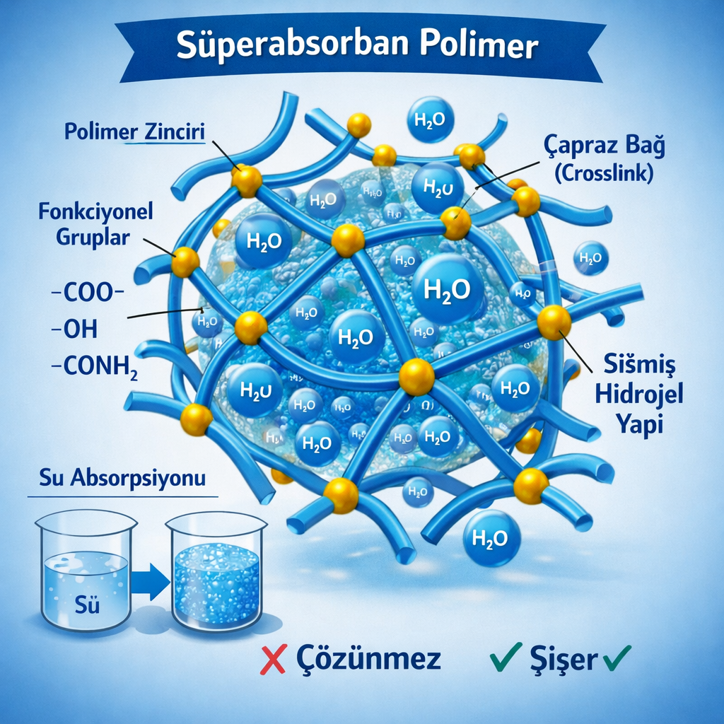 Bu malzemeler, polimer zincirleri üzerindeki iyonik ve fonksiyonel gruplar sayesinde suyu fiziksel ve kimyasal olarak tutar.